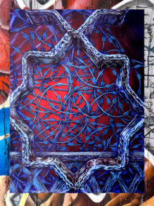 Mär Martinez, a Syrian American artist and Fulbright scholar, presents new work developed during her 2025–26 Fulbright research in Istanbul. Her project investigates traditional Turkish and Middle Eastern textile techniques while reflecting on themes of urbanization, surveillance, and cultural memory. Drawing from nighttime walks through Istanbul’s neighborhoods, Martinez transforms architectural barriers, barbed wire, fences, hostile design, into motifs of resistance and reweaving. Her haunting wood paintings explore personal heritage, global textile history, and contemporary social commentary in poetic, layered form.